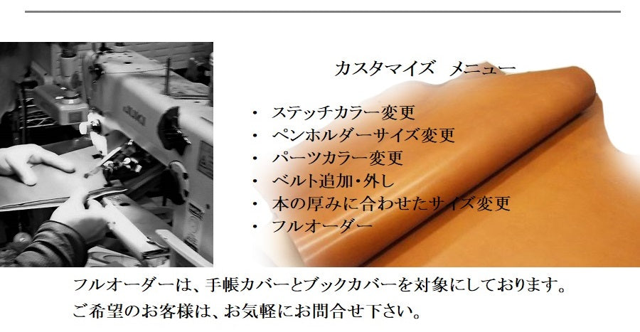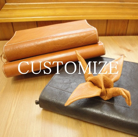 当店で販売していない規格の本、手帳、ノート、台本などの本革製カバーをお客様のご要望に応じて作製致します。仕上がりまでの期間は、内容により異なりますので予めご了承を願いします。料金は、ご希望の内容でお見積りを致します。